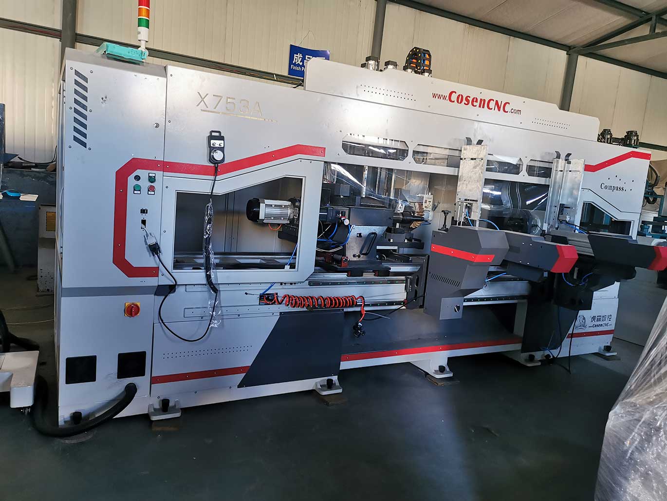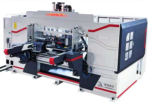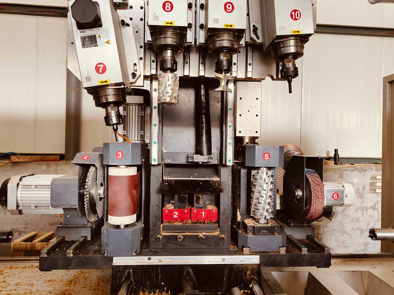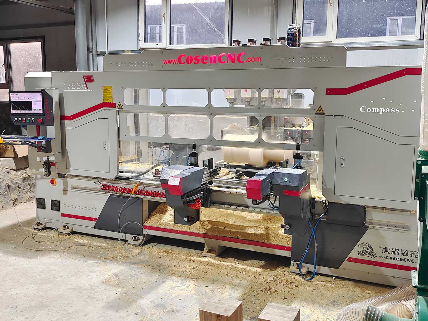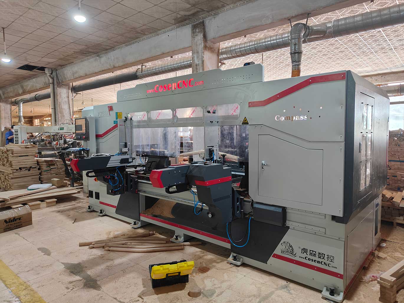 設(shè)備特點(diǎn):這是一款四軸10工序車銑復(fù)合加工中心,可實(shí)現(xiàn)自動(dòng)上料、雙刀車木、立柱刨銑、圓砂打磨、鋸片大吃刀量切削、四工序主軸(可實(shí)現(xiàn)打孔、倒角、拉線、榫槽、榫孔、鏤空、雕刻等功能,兩側(cè)主軸電機(jī)可手動(dòng)調(diào)整角度實(shí)現(xiàn)15度以內(nèi)斜孔加工),此型號(hào)設(shè)備功能更多,配置更齊全,適合加工更加復(fù)雜的工件,如臺(tái)球桌腿、異形復(fù)雜實(shí)木家具工件、實(shí)木家具腿等一次成型。